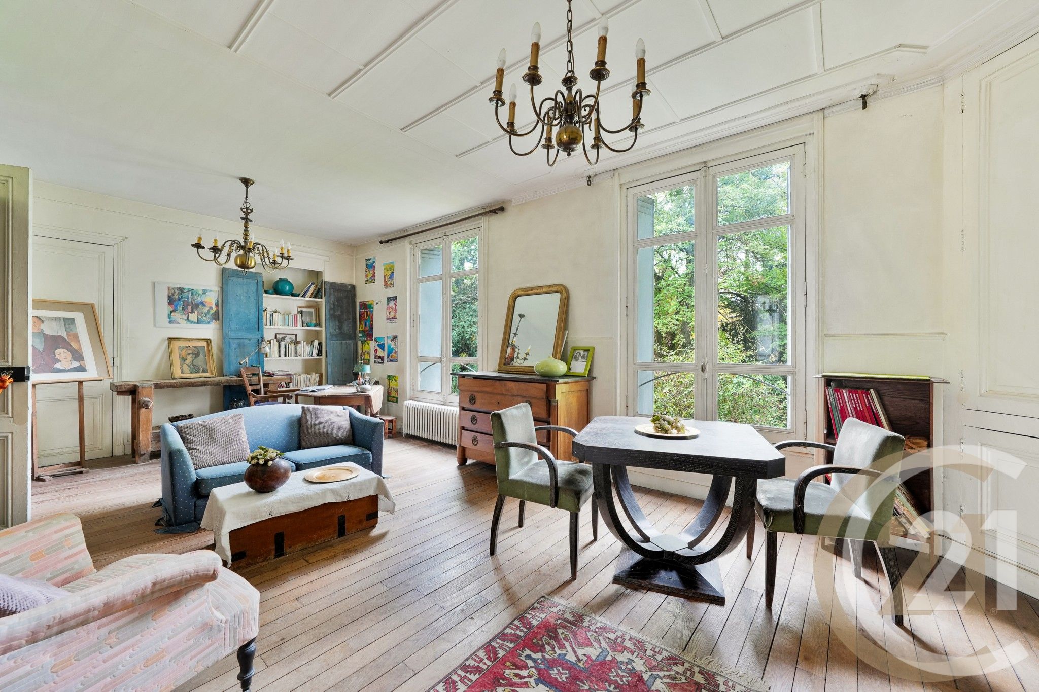 Elle offre de beaux volumes avec une hauteur sous plafond remarquable, un séjour double de 40 m² parqueté lumineux avec cheminée, et une configuration modulable permettant plusieurs agencements possibles.